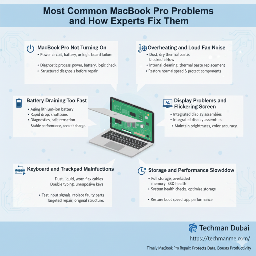 This guide explains the most common MacBook Pro issues, their real causes, and how trained technicians fix them using structured repair methods.